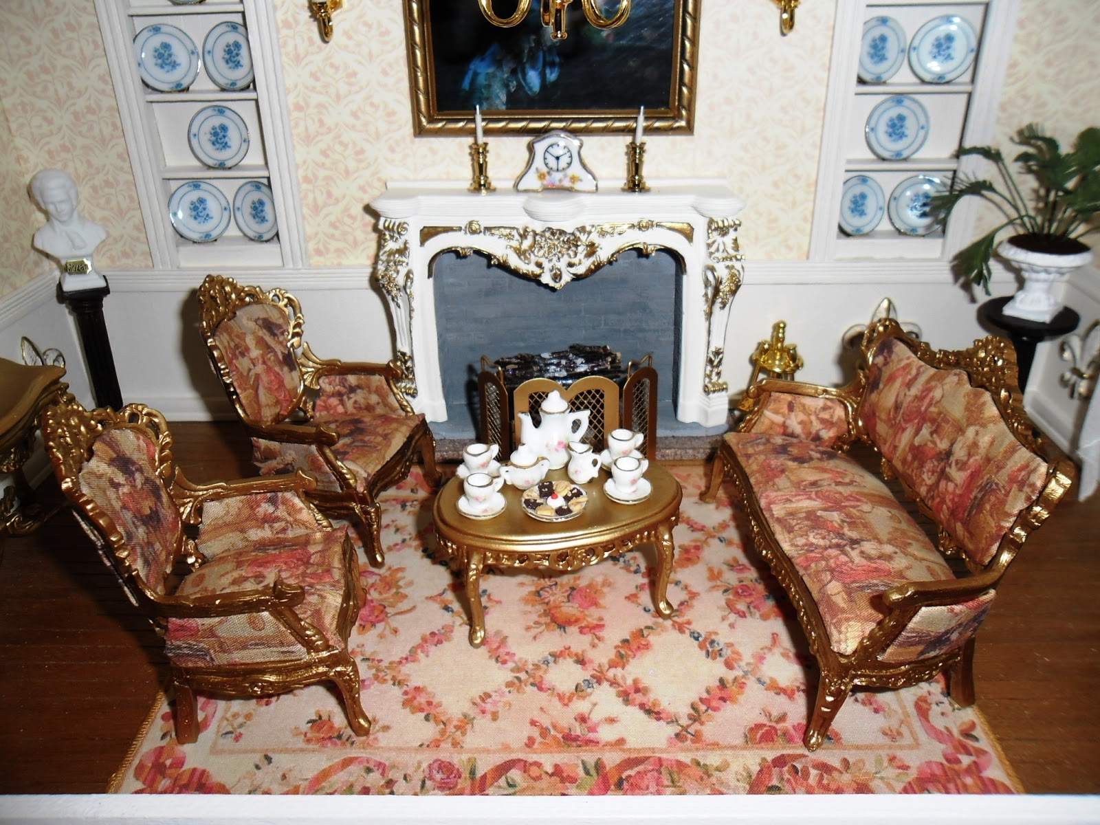 Uma salinha francesa alusiva à rainha Maria Antonieta, um trabalho que adorei fazer mas foi o mais difícil até hoje, pelo requinte de peças que impera e pela dificuldade de as encontrar principalmente. Bom meti mãos à obra para este cenário, cortei sancas, pintei peças, pintei os sofás e estofei com tecido imprimido no padrão da época, fiz a lareira, quadros e foi electrificada com um belíssimo candeeiro. Apesar de já me terem oferecido um valor muito alto por ele um ambiente que nunca vou vender, pelas horas de sono perdidas e pelo desafio de mais uma peça de alto valor concluída!